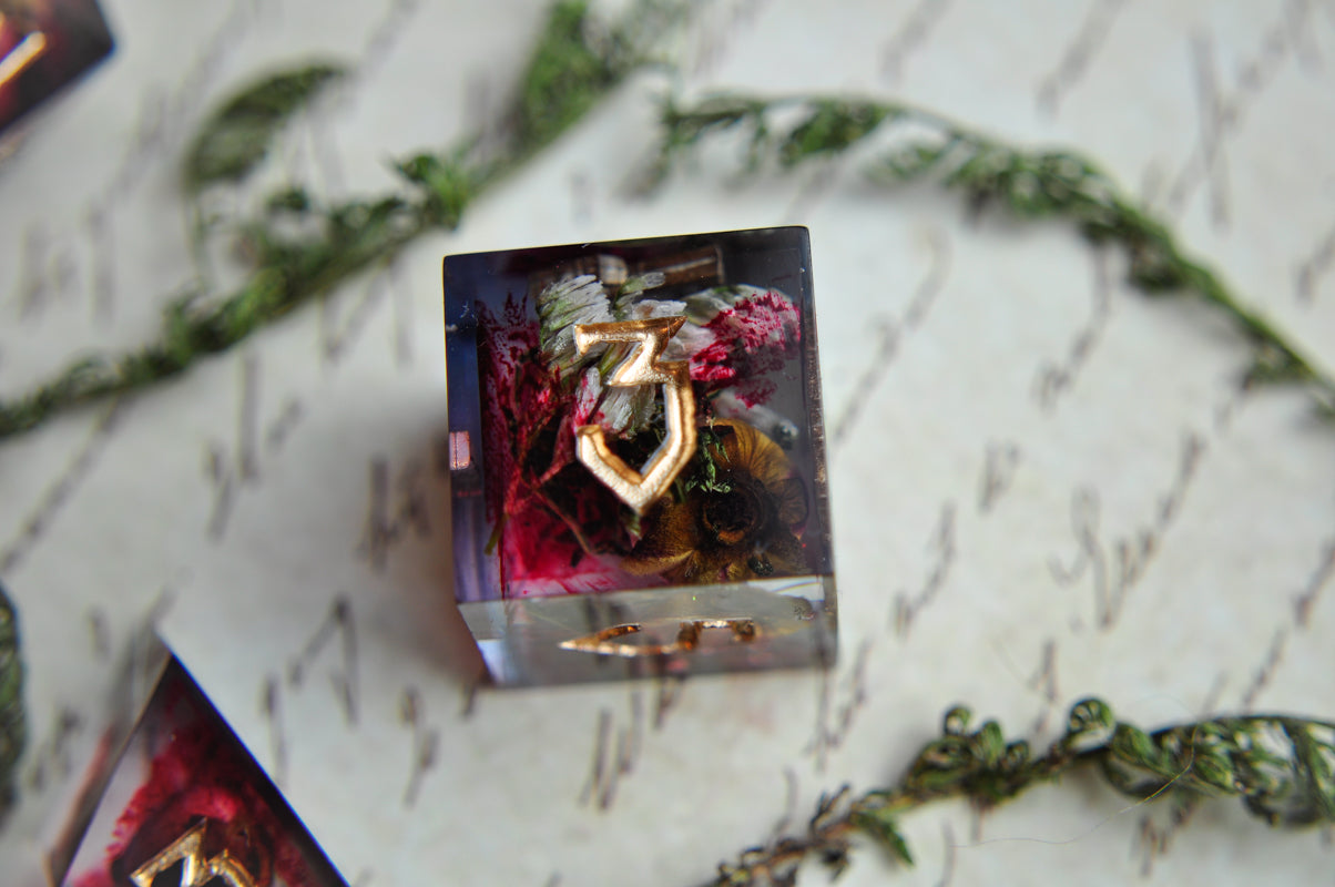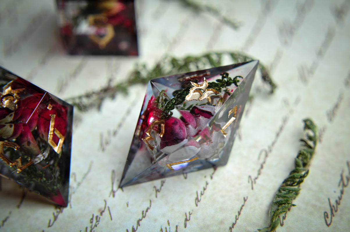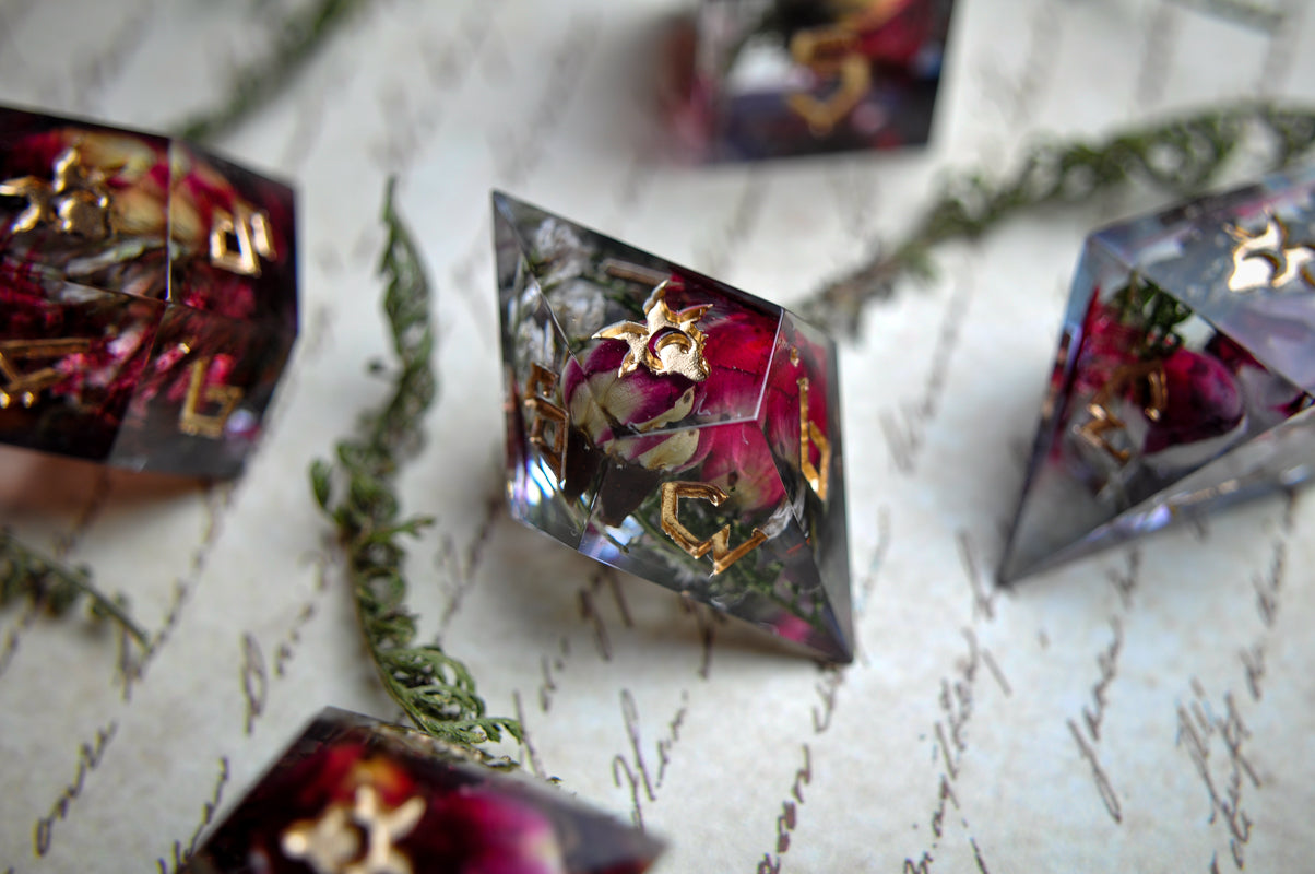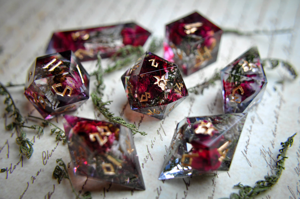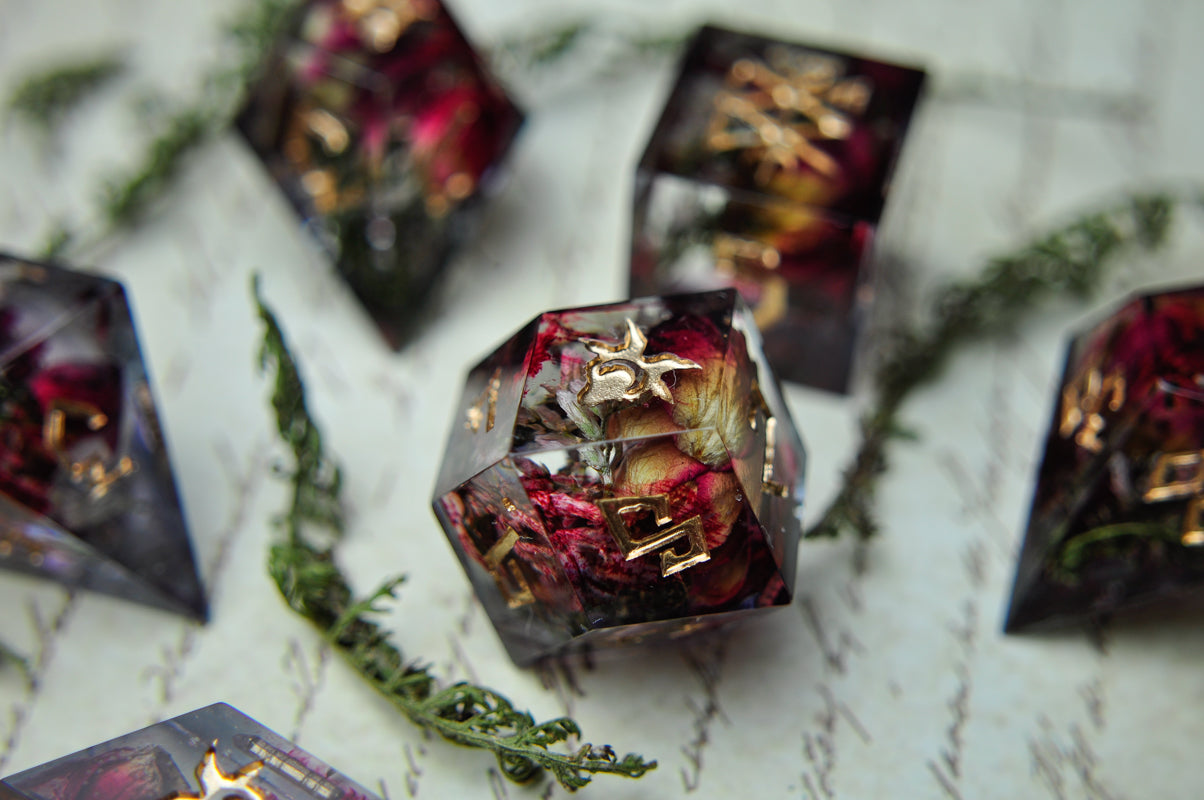 This listing is for a 7 pc set. Each dice has roses and dried yarrow leaves, with streaks of "blood".