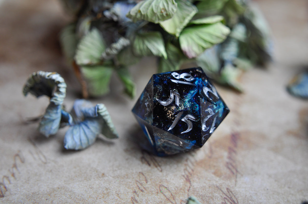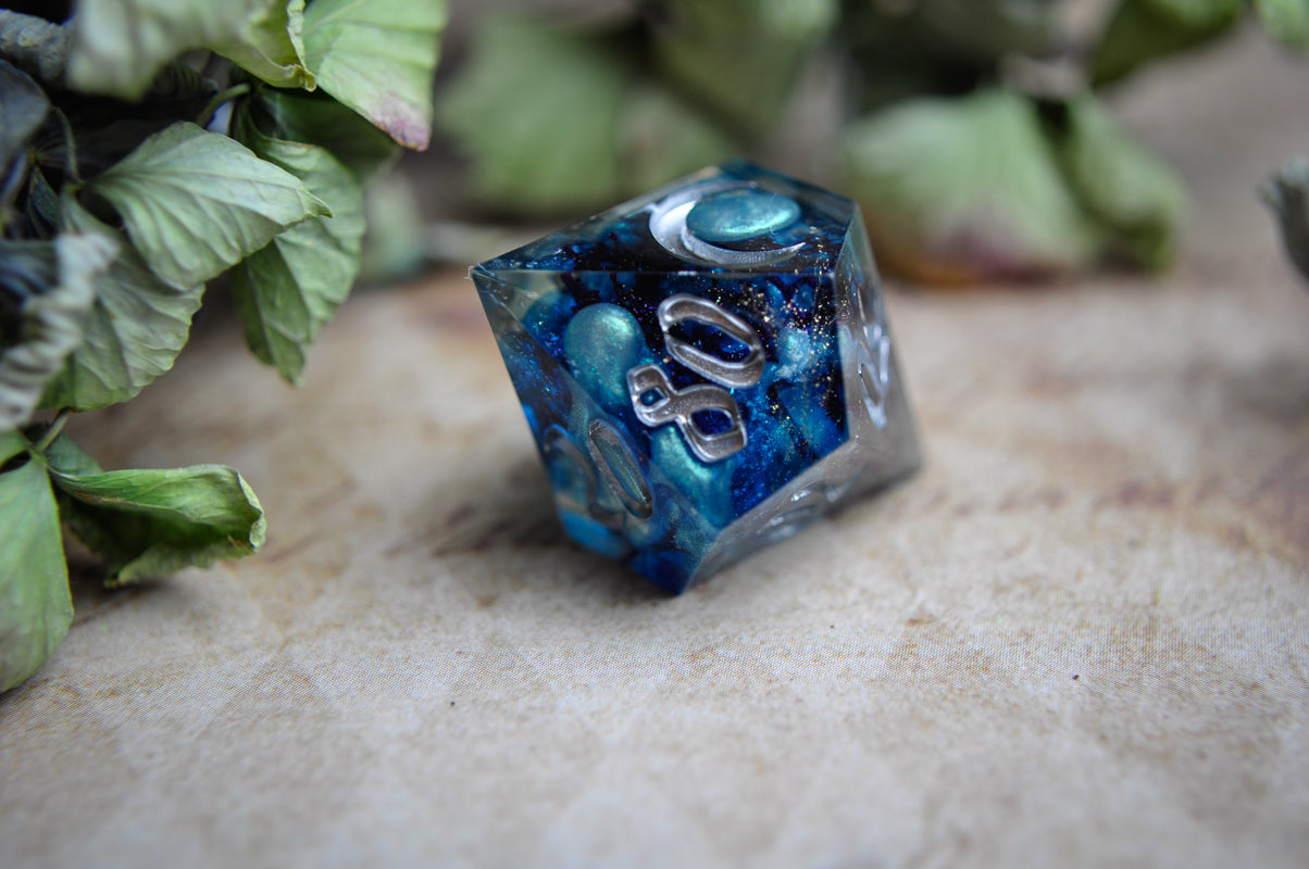 This listing is for a full 7 piece set, with our crescent moon logo on the highest face of each die.