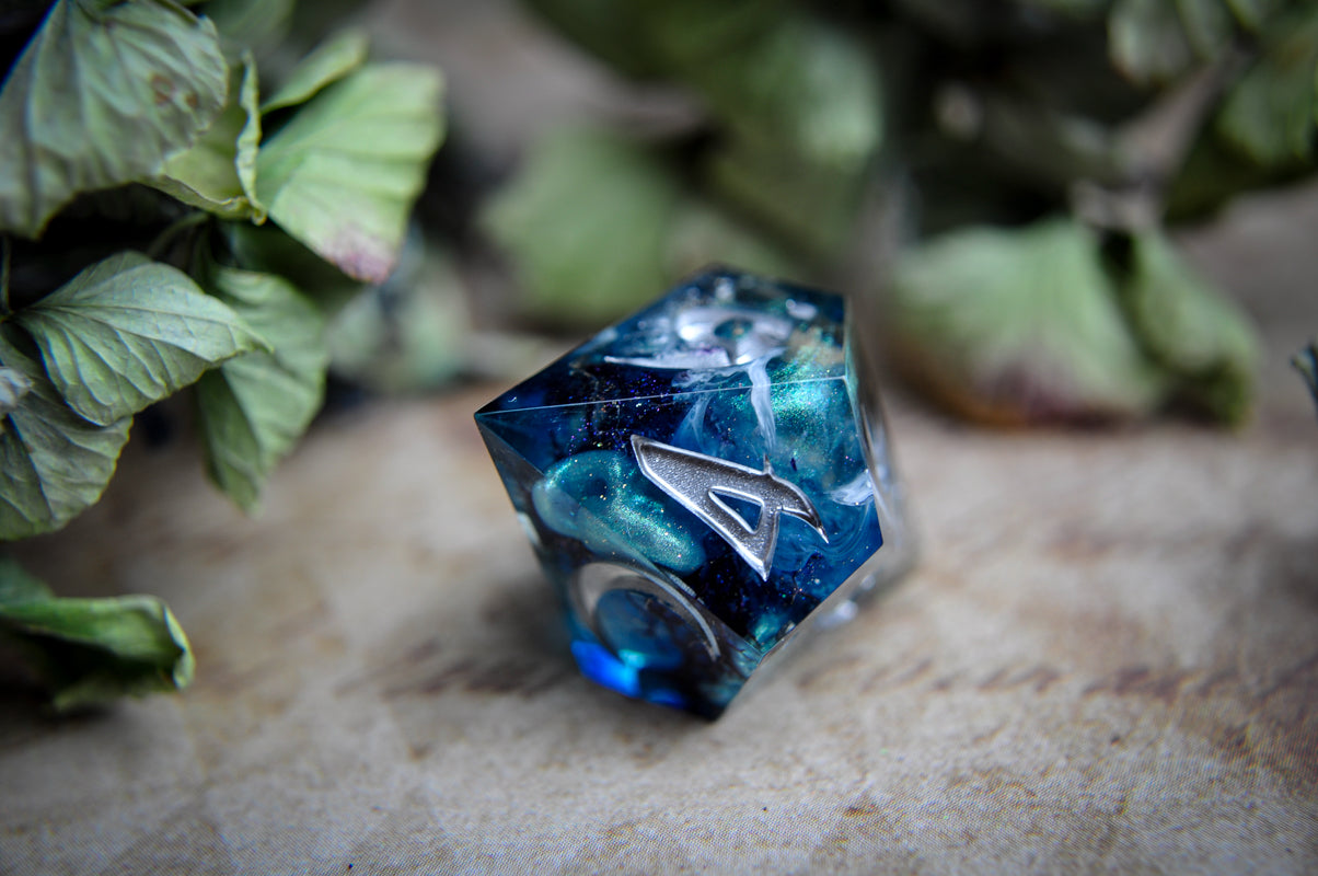 Notable flaw: The 1 face of the d8 had a void by the number. It was filled in, sanded and polished, but there is some visual evidence of where it was (shown in photos). This is purely cosmetic and will not effect the function of the dice.